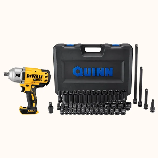 To ensure you have everything you need, this rental also includes the QUINN 1/2 in. Drive SAE and Metric Master Impact Socket Set. This 61-piece set is made from heat-treated chrome molybdenum steel, making it fully impact-rated for use with this high-torque wrench. The set includes a full range of shallow and deep sockets, extension bars, and adapters, all organized in a heavy-duty storage case.
